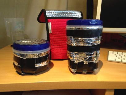 After reading  Hyperlight Mountain Gear’s great blog and trying out a couple of recipes, I decided to experiment with a coconut beans and rice recipe, adapting it for the backcountry. You can use a cozy and either rehydrate in an oversized vacuum seal bag or a quart-sized Zip-Lock bag, or dump the contents into an insulated twist-top container. The first two options are optimum for no cleanup. Antigravity gear sells both the cozy pouches themselves, which fit a standard quart Zip-Lock bag, and kits to convert Zip-Lock’s Twist-top containers into insulated containers. Other sites probably do, too, but Antigravity Gear is a great place to start — I actually have their pouches but used double-backed tape, Gorilla Tape, and a roll of (looks like silver bubble wrap) duct insulation to make my own insulated Zip-Lock twist-top container.